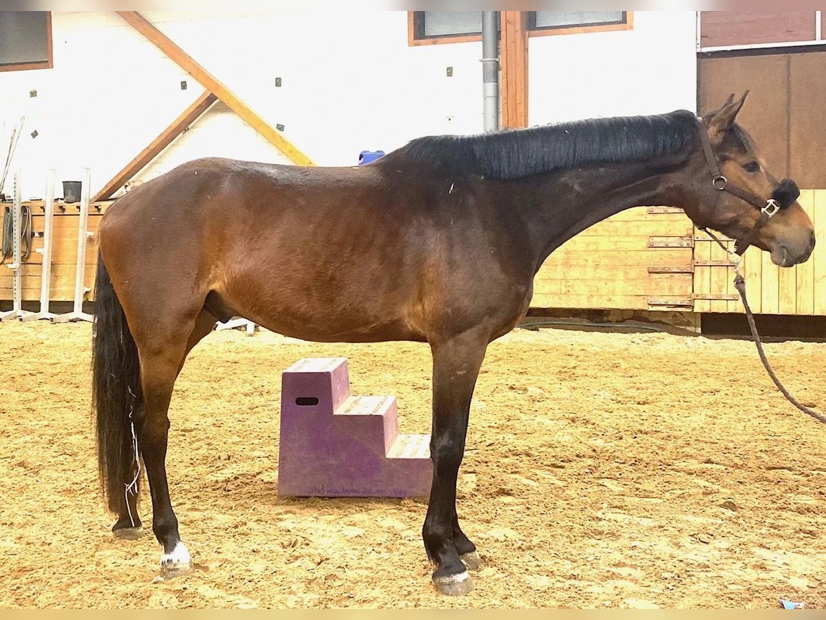 Chic 4-year-old bay gelding, standing 1.70 m, sired by a son of Comme il faut (Cornet Obolensky) out of Heartbreaker, and out of Kavinia (Numero Uno), one of the best KWPN jumping lines. He has recently been backed: trained in all three gaits and jumping under saddle. Very willing and suitable for amateurs, he has an innate sense for the jump, is built for it, and has a very good back passage! Minimum potential of 135 cm in the future. Flexible, stylish, balanced, and very elegant, with exceptional gaits! He is currently ridden outdoors (accompanied for now) and is not fazed by anything.