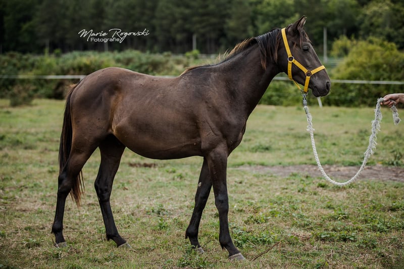 Late-born young stallion (12.09.2022) from color breeding program. Son of the exceptional English thoroughbred in smoky-cream T C F Palladium xx (True Colours Farm Canada) and an equally rare classic champagne warmblood mare (!!!) (ZfDP) by Rapptänzer OLD - Khalvin Khlein KpM (Partbred Arabian special champagne USA). Born in France with Zangersheide passport (main book) and IFCE. Very harmonious, compact young stallion with a simple Créme gene, which he can also pass on. Versatile and versatile. His final height will be around 162-164 cm at the age of six. Now the youngest boy in the group, he is enjoying his youth out in the field rearing big lads, while maintaining daily contact with people and handling them with curiosity and determination at stud. Feeding, grooming, hoof care, leading, ground course and loading (truck transport) are familiar, as are worming and vaccination. Last Smoke goes into careful, nurturing hands, can also stay for another year for needs-based rearing (with an old stallion) and will be trained further.