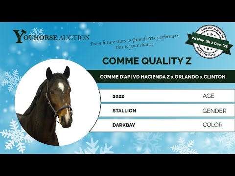 De driejarige Comme Quality Z valt meteen op met zijn mooie model, grote galop en lichtvoetigheid. Hij springt snel van de grond. Zijn halfzus Happy Louca M sprong 1.40m parcoursen met Magali van Neste (BEL). Vader Comme d’Api vd Hacienda sprong 1.60m Grand Prix. Deze Cumano-zoon is ook de vader van Hello Mr. President (1.60m GP) en Comme One Z (1.50m springen). Moeder Carara is via de 1.60m Grand Prix-hengst Orlando een kleindochter van de topvererver Heartbreaker (1.60m Grand Prix met Peter Geerink). Grootmoeder Window stamt af van de olympische hengst Clinton x Faust Z.