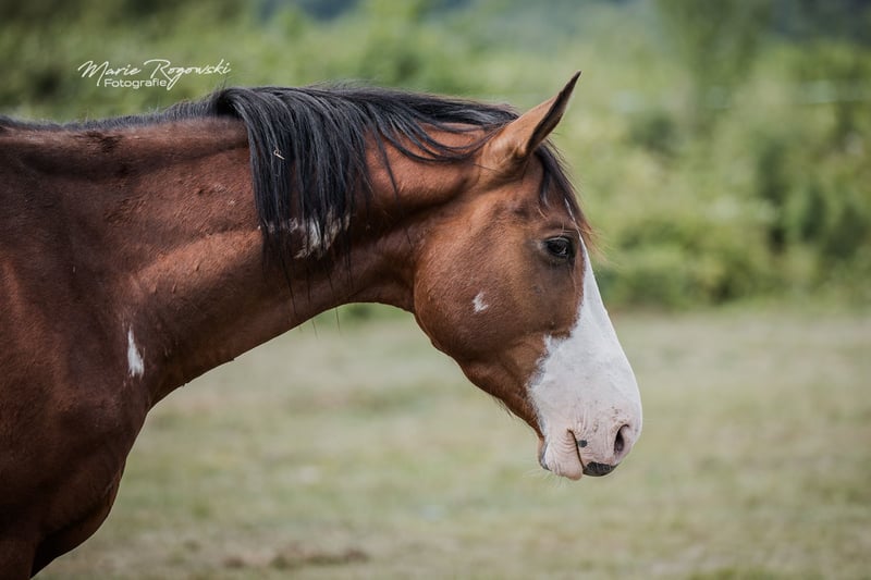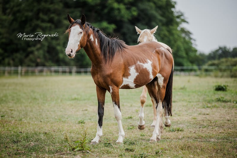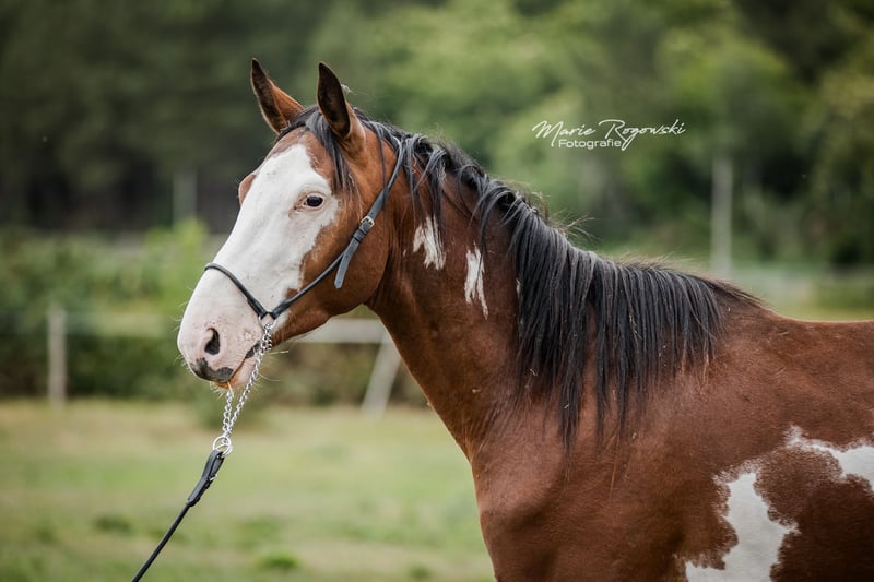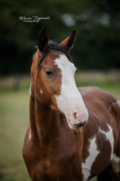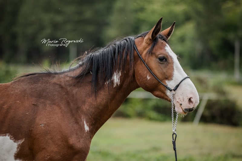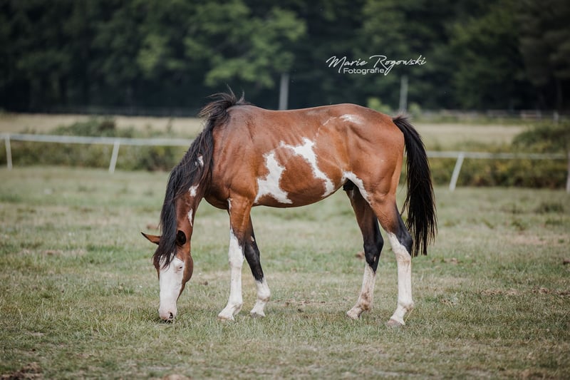 With this horse, you will always stand out! Rare markings with three ORION stars on the left side of the neck. Sire: our Trakehner SIR GLÜCKSKEKS (Gorbatschow - Sanssouci), dam: RICHES, Thoroughbred (racehorse) from the USA (Jockey Club) in the rare special color chestnut with frame-overo pattern (Ellusive Quest xx - Dancebel xx). One of our proven broodmares of the last decade. She is closely related to the sire line of SILVERY MOON xx, which has been successfully used for warmblood refinement at the HuL Stud Marbach. ORION is her sixth of seven foals so far, the last four of which were bred at our stud. ORION has been living freely in the young stallion group and will be gelded here at the stud after the contract is signed, before handover. He will not be sold as a stallion due to a minor, insignificant finding. To date, he is not showing any stallion-like behavior, and all our stallions are kept in paddocks next to many mares. He is suitable for a petite rider, and we want his delicate, somewhat introverted nature to be appreciated throughout his life. This lifelong placement is agreed upon, and the purchase price is accordingly low. In case of resale, an appropriate additional payment would be required. Our breeding goal is versatile leisure horses for the down-to-earth horse owner who, as a good rider of classical training, promotes and gymnasticizes the animals in harmony with their development. The foals grow up in mixed groups on large pastures, outdoors all year round. The rather sparse soil strengthens the growing youngsters, who are supplemented as needed with constant access to organic hay and straw and find minerals with energy requirements adjusted. Regularly dewormed (ZSE), fully vaccinated, and the hooves are kept in shape through hoof orthopedics. The herd is managed holistically and primarily with natural remedies. From the second year of life, the boys are in the "Wild Guys" group with an older stallion who teaches them about life. They have daily contact with us humans and look forward to it. They are already familiar with many everyday things, including ground courses, round pen, or under the solarium. Nevertheless, we must pass them on - only to the best hands. Further details in a personal conversation.