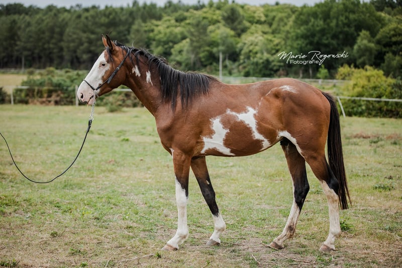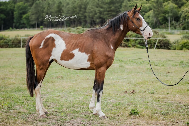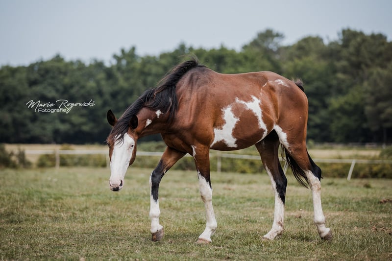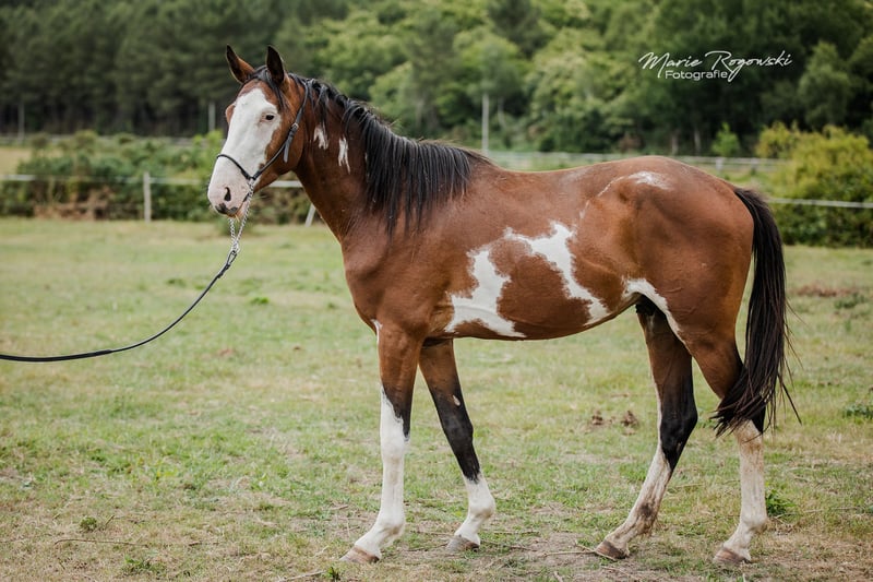 Avec ce cheval, vous ne passerez jamais inaperçu ! Rare robe avec trois étoiles d'ORION sur le côté gauche de l'encolure. Père : notre Trakehner SIR GLÜCKSKEKS (Gorbatschow - Sanssouci), Mère : RICHES, Pur-sang anglais (galopeur) des États-Unis (Jockey Club) dans la rare couleur spéciale alezan avec robe pie frame-overo (Ellusive Quest xx - Dancebel xx). L'une de nos juments reproductrices éprouvées de la dernière décennie. Elle est étroitement liée à la lignée paternelle de SILVERY MOON xx, très bien positionné pour l'amélioration du sang chaud au Haras de Marbach. ORION est son sixième poulain sur sept à ce jour, dont les quatre derniers ont été élevés dans notre haras. ORION vit jusqu'à présent librement dans le groupe de jeunes étalons et sera castré ici au haras après la conclusion du contrat avant la remise. Une vente en tant qu'étalon ne se fera pas en raison d'un petit constat insignifiant. Il n'est pas encore en rut et tous nos étalons se trouvent dans des paddocks à côté de nombreuses juments. Il convient à un/une cavalier/ère léger/ère et nous souhaitons que son caractère délicat et quelque peu introverti soit apprécié tout au long de sa vie. Ce lieu de vie sera convenu et le prix d'achat est donc relativement bas. En cas de revente, un paiement supplémentaire approprié serait dû. Notre objectif d'élevage est de produire des chevaux de loisir polyvalents pour le cavalier de base, qui, en tant que bon cavalier de l'école classique, encourage et gymnastique les animaux en harmonie avec leur développement. Les poulains grandissent en groupes mixtes sur de grands pâturages en extérieur toute l'année. Le sol plutôt pauvre renforce les jeunes, qui reçoivent une alimentation complémentaire adaptée à leurs besoins, avec un accès libre et constant au foin et à la paille bio, ainsi qu'aux minéraux avec un complément énergétique ajusté. Régulièrement vermifugés (ZSE), immunisés de base et les sabots maintenus en forme par un orthopédiste équin. Le cheptel est géré de manière holistique et principalement avec des méthodes naturopathiques. À partir de la deuxième année de vie, les jeunes rejoignent le groupe "Wilde Kerle" avec un vieil étalon qui leur explique la vie. Ils ont un contact quotidien avec nous, les humains, et s'en réjouissent. Ils connaissent déjà beaucoup de choses du quotidien, parfois sur le parcours au sol, le rond de longe ou sous le solarium. Cependant, nous devons les céder - uniquement aux meilleures mains. Tout le reste lors d'une conversation personnelle.