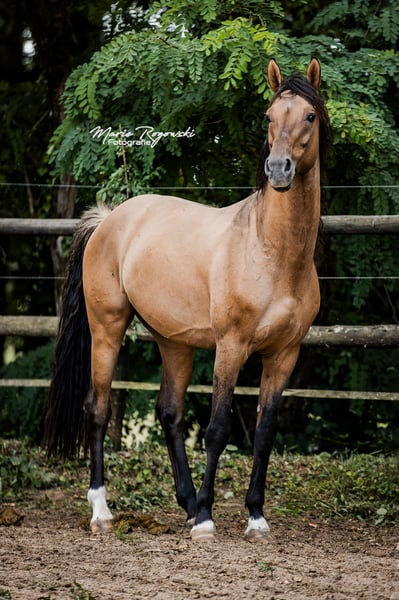 Étalon Zangersheide bai dun | né en 2018 | 163 cm Étalon approuvé pour AES, Zangersheide Génétique : E/e A/a D/n Testé négatif pour ECVM, PSSM2, MFM, RER (panel CAG) Fabelkönig est un étalon doté d'une grande prestance et d'un comportement irréprochable. Il a été débourré en 2024 et fait preuve d'enthousiasme et d'un grand potentiel. Depuis lors, il n'a pas pu être travaillé davantage en raison de contraintes de temps, mais il serait prêt à commencer l'entraînement immédiatement. Fabelkönig est peut-être le seul étalon de sang chaud agréé qui transmet la couleur dun. Il tient sa couleur de sa mère Funny Girl, également une jument baie dun que vous pouvez voir dans notre haras. Trois autres descendants de la même mère peuvent également être vus dans notre haras. Dans le célèbre haras Trakehner de Merzdorf, l'étalon norvégien Fjord Emil *1972 a couvert la jument pur-sang anglaise Feinsliebchen, qui est inscrite dans le stud-book principal de l'élevage allemand Trakehner. L'association Trakehner, puis la ZfDP, ont reconnu cette filiale, qui s'est qualifiée pour le stud-book principal. Il s'agit de la grand-mère de Funny Girl. Cela signifie que Fabelkönig a désormais du sang étranger dans sa quatrième génération et que ses poulains peuvent donc être enregistrés auprès de nombreuses associations sportives renommées. Le père de Fabelkönig est l'étalon Fürst Wilhelm, originaire de la Spree, qui porte tous les grands noms de la lignée de dressage, et sa carrière sportive parle d'elle-même.