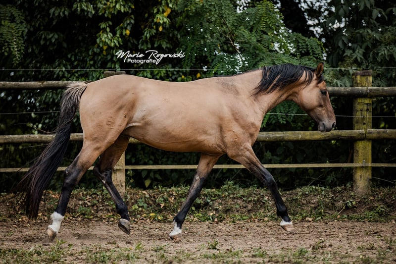 Zangersheidehengst in Braunfalb (Bay Dun) | geb. 2018 | 163 cm bewerteter, gekörter Hengst für AES, Zangersheide Genetik: E/e A/a D/n Getestet frei von ECVM, PSSM2, MFM, RER (CAG Panel) Fabelkönig ist ein Hengst mit toller Präsenz und trotzdem einwandfreiem Benehmen. Er wurde 2024 eingeritten und zeigt sich eifrig und mit viel Potenzial. Seitdem konnte er aus zeitlichen Gründen nicht weiter gearbeitet werden, wäre aber sofort Startklar fürs Training. Fabelkönig ist der vielleicht einzige gekörte Warmbluthengst der die Falbfarbe vererbt. Die Farbe hat er von seiner Mutter Funny Girl, einer ebenfalls Braunfalb Stute die bei uns besichtigt werden kann. Aus der selben Mutter sind auch 3 weitere Nachkommen bei uns auf dem Hof zu besichtigen. Im renommierten Trakehner Gestüt Merzdorf deckte der gekörte norwegische Fjordpferde Hengst Emil *1972 die im Hauptstammbuch der deutschen Trakehnerzucht eingetragene Englische Vollblutstute Feinsliebchen. Trakehnerverband und später ZfDP erkannten dies an und das Stutfohlen qualifizierte sich für das Hauptstutbuch. Das ist die Großmutter von Funny Girl. Somit ist bei Fabelkönig das Fremdblut inzwischen in der 4. Generation und seine Fohlen sind somit bei vielen renomierten Sportverbänden zulassungsfähig. Fabelkönigs Vater ist der Spree Hengst Fürst Wilhelm bringt alles was im Dressursport Rang und Namen hat und auch seine sportliche Karriere spricht für sich.