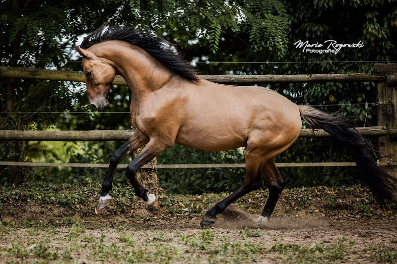 Zangersheide stallion in bay dun | born 2018 | 163 cm Approved stallion for AES, Zangersheide Genetics: E/e A/a D/n Tested free of ECVM, PSSM2, MFM, RER (CAG Panel) Fabelkönig is a stallion with great presence and impeccable behaviour. He was broken in in 2024 and shows enthusiasm and great potential. Since then, he has not been able to be worked on further due to time constraints, but would be ready to start training immediately. Fabelkönig is perhaps the only licensed warmblood stallion that passes on the dun colour. He got his colour from his dam Funny Girl, also a bay dun mare who can be viewed at our stud. Three other offspring from the same dam can also be viewed at our stud. At the renowned Trakehner stud farm in Merzdorf, the licensed Norwegian Fjord horse stallion Emil *1972 covered the English thoroughbred mare Feinsliebchen, who is registered in the main stud book of German Trakehner breeding. The Trakehner Association and later the ZfDP recognised this and the filly qualified for the main stud book. This is Funny Girl's grandmother. This means that Fabelkönig now has foreign blood in the 4th generation and his foals are therefore eligible for registration with many renowned sports associations. Fabelkönig's sire is the Spree stallion Fürst Wilhelm, carrying every big name there is when it comes to dressage lineages, and his sporting career speaks for itself.