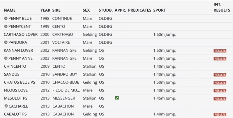 Diamante de Plaisir / Messenger / Latus: puledra nata nel 2024 Questa puledra del 2024, figlia di Diamante de Plaisir su Messy Lover PS (Messenger x Latus I), rappresenta un raro gioiello di una delle famiglie di cavalli sportivi più prolifiche in Europa. Con numerosi performer di 1,60 m in stretta parentela e un pedigree ricco di stalloni di élite, offre un potenziale eccezionale sia per lo sport che per l’allevamento. La fattrice Messy Lover PS (Messenger x Latus I) è sorella completa dello stallone stallone approvato Mesulot PS e parente diretta di: Carthago Lover – 1,60 m Kannan Lover – 1,60 m Chatus Blue PS – 1,55 m Penny Anne – 1,50 m La sua fattrice Penny Lover (Latus I x Pilot) appartiene allo stampo Westfälisches Stamm 415, una linea materna nota per la produzione di cavalli da salto di élite e stalloni approvati nel corso delle generazioni. I fratelli e parenti stretti di Messy Lover hanno prodotto una notevole lista di performer internazionali e stalloni approvati, tra cui: Centolove (1,60 m) Elan Blue (1,50 m) Baccentus (1,60 m) Balou Lover (1,50 m, stallone approvato) Gabbiano 11 (1,60 m) Bond Lover (1,50 m) Sancento (1,50 m) Balou’s Penny PS (1,55 m) Versandro (1,50 m) BS Chaccalina (1,55 m) Chacco Lover (1,60 m, stallone approvato) Chacanntus (1,60 m) … e molti altri.