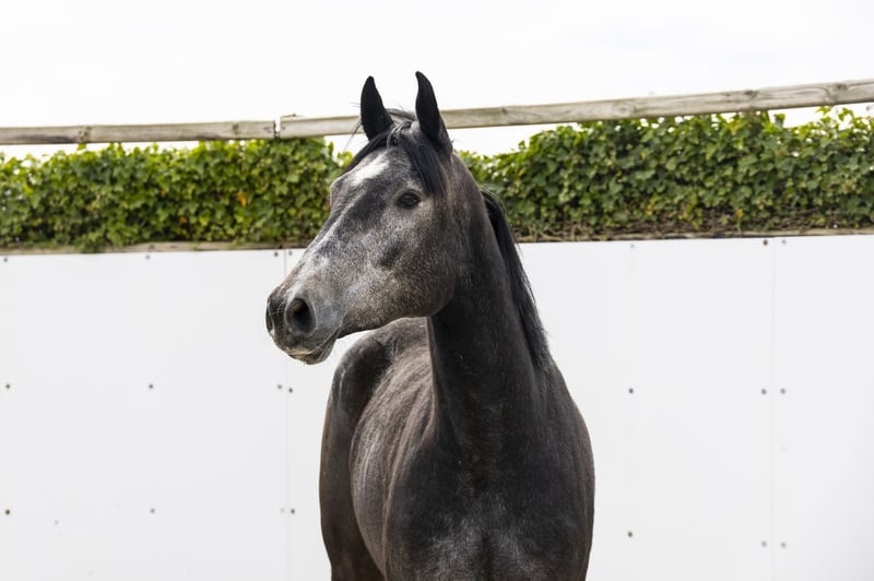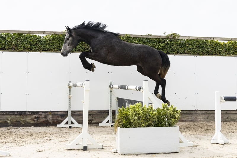 Grey mare, long-lined and strong model with a good attitude. Shows carefulness on the jump and shows that she is willing to cooperate. Is still very green. Sire CONTAGIO – 1.60/1.65m International showjumper, passes on scope, reflexes and attitude. Proven bloodline with multiple offspring at high level. Dam RAYON DE SOLEIL VAN DE GROTE HOEF Young mare, bred out of a strong performance-oriented line. Damline / family Granddam: HEMKE DE KALVARIE – 1.20m Further in the line: PUSKAS DE KALVARIE – 1.55m QUATTRO DE KALVARIE – 1.50m OTTO DE KALVARIE – 1.55m (approved stallion) PLATINI DE KALVARIE – 1.60m CHIC HIN D’HYRENCOURT – 1.60m VIRTUOSE D’HYRENCOURT – 1.60m (approved stallion) UNIQUE D’HYRENCOURT – 1.55m ALANIX HERO Z – 1.50m Approved stallions in the line incl.: OTTO DE KALVARIE, VIRTUOSE D’HYRENCOURT