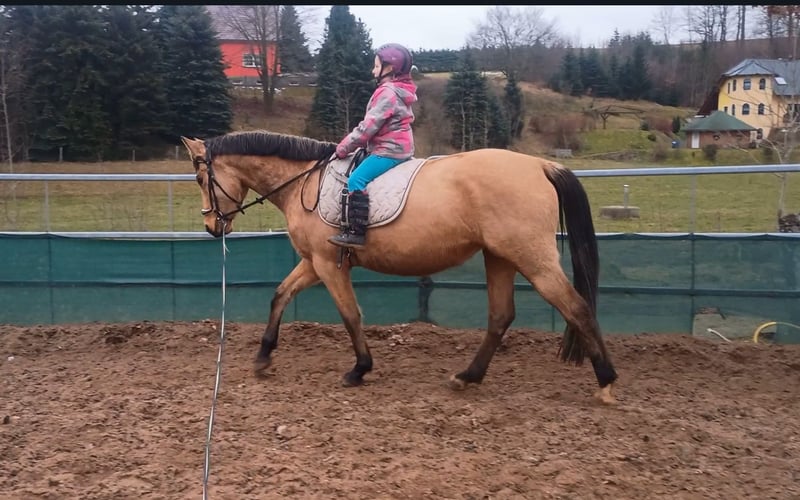 Wir geben schweren Herzens auf Grund von Bestandsreduzierung unsere selbstgezogene Stute only ab. Sie ist 4 Jahre und hat zur Zeit ein Stockmaß von 1,60m, denk aber da kommen noch ein paar cm dazu!Sie hat die tolle Farbe buckskin.Only ist doppelveranlagt hat volle Papiere von Zangersheide.sie läuft schon sehr gut in Anlehnung und auch das Dressur reiten macht mega spaß mit ihr,auch kleine Sprünge meistert sie schon. Only wurde 3jährig eingeritten und kennt mit ihren jungen Jahren schon Recht viel.Gelände allein und in der Gruppe sind kein Problem, Reitplatz und Halle kennt sie auch.Trabstangen und Freispringen haben wir alles schon gemacht,das Longieren mit normaler und doppellonge macht ihr spaß und sie hört super auf Stimme sie ist immer eifrig dabei ohne überzudrehen.Sie hatten einen angenehmen Vorwärtsdrang aber ist auch immer leicht zurück zunehmen.Das Verladen kennt sie und geht problemlos . Sie ist bei allem sehr brav,dennoch definitiv noch KEIN Kinder oder Anfängerpferd mit 4jahren!!!.Hufschmied ist regelmäßig da zur Zeit ist sie 4x beschlagen,entwurmt und geimpft ist sie natürlich auch. Sie steht bei uns im Offenstall und kommt mit allen Pferden gut zurecht. Hat keine Krankheiten und ist gesund. Uns fehlt leider die nötige Zeit um sie weiter auszubilden und zum rumstehen ist sie definitiv zu schade. Ich wünsche mir für sie Menschen die sie weiter fördern.