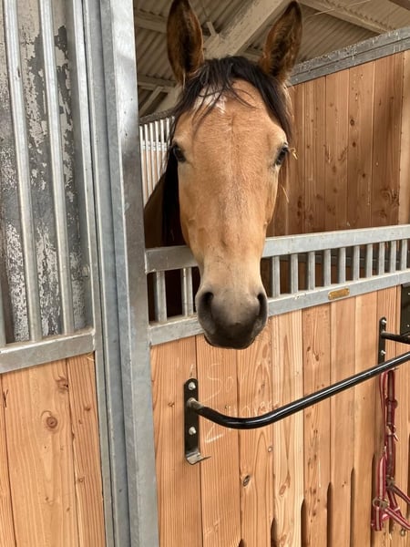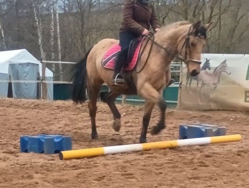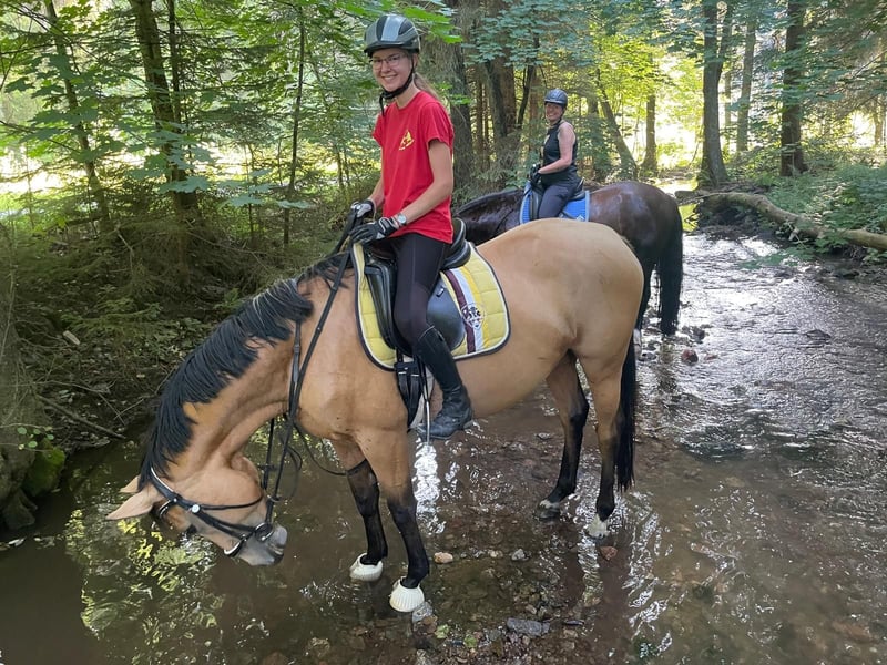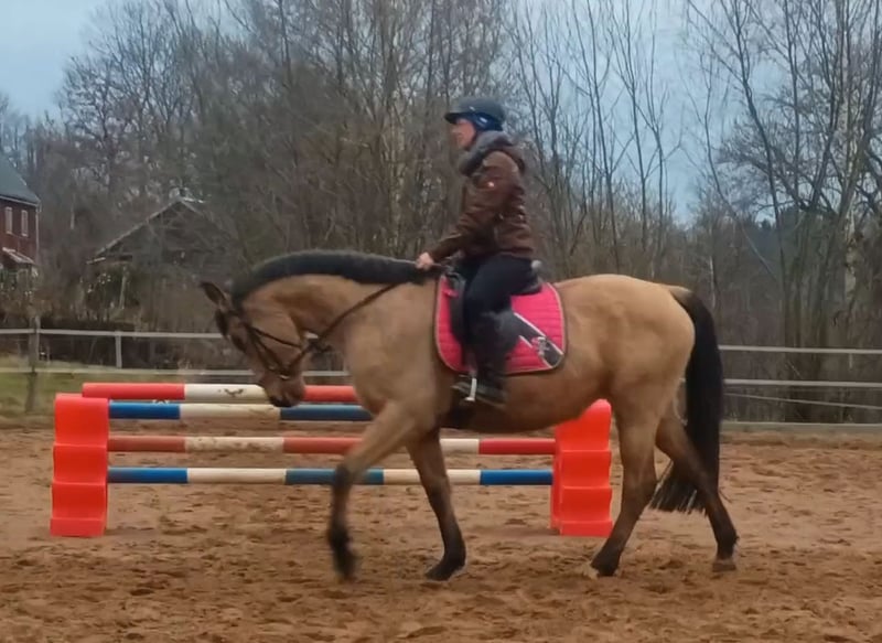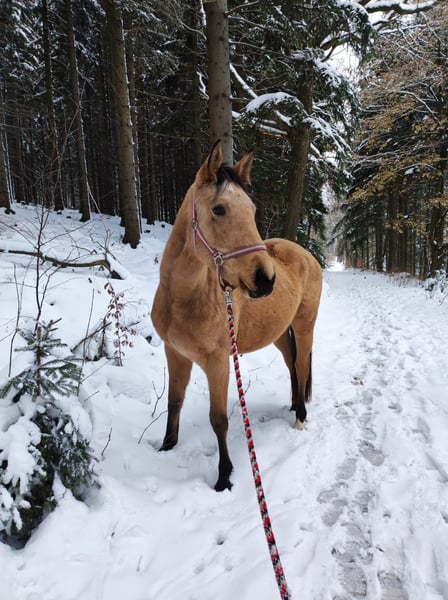 With a heavy heart, we are offering our self-bred mare due to a reduction in our herd. She is 4 years old and currently measures 1.60 meters at the withers, but we expect her to grow a few more centimeters! She has the beautiful buckskin color. Only is double-licensed with full papers from Zangersheide. She already moves very well in hand and riding dressage is a real pleasure with her; she also jumps small obstacles confidently. Only was backed at three years old and, despite her young age, has already learned quite a lot. She is comfortable riding alone or in a group, and she is familiar with the riding arena and indoor riding hall. We have already worked on ground poles and free jumping. Lunging with both single and double longe is fun for her, and she responds very well to voice commands. She is always eager without becoming overexcited. She has a pleasant forward drive but is also easy to slow down. She knows how to be loaded into a trailer and does so without issues. She is very well-behaved in everything she does, but at 4 years old, she is definitely NOT a beginner or children's horse. Her hooves are regularly maintained; she is currently shod four times a year, dewormed, and vaccinated. She is kept in an open stable and gets along well with all other horses. She has no health issues and is in good health overall. Unfortunately, we lack the time to further train her, and she is far too good to just stand around. We wish for her to find people who will continue to develop and promote her.