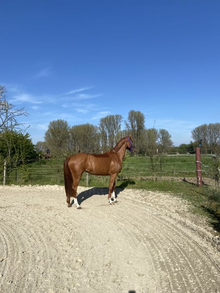 For sale is a stunning chestnut mare, born in 2021, currently measuring 15.8 hh. She comes from a renowned Zangersheide breeding program and impresses with her noble appearance as well as her promising dressage and show jumping qualities. The mare is ideal for ambitious riders, whether for young riders or, for example, for a mother-daughter pair, seeking a reliable partner for dressage or jumping. In her basic training, she is very attentive and eager to learn, with three excellent gaits. She is a true sweetheart in handling! Calm, gentle, and very fond of being pampered. She is familiar with children, dogs, and tractors, and remains completely relaxed in all situations. Due to lack of time, we are looking for a new, loving home where she can continue to develop her full potential. Please feel free to contact me for more information or to arrange a viewing.