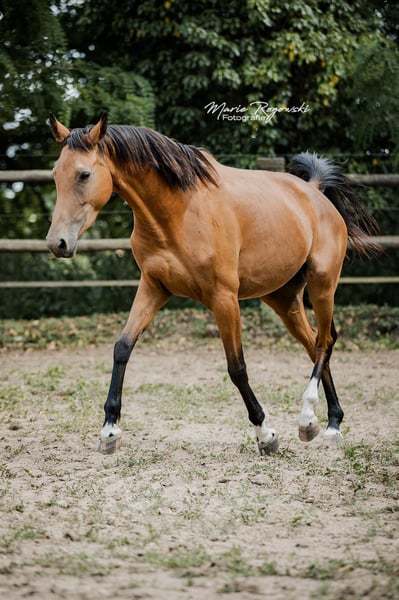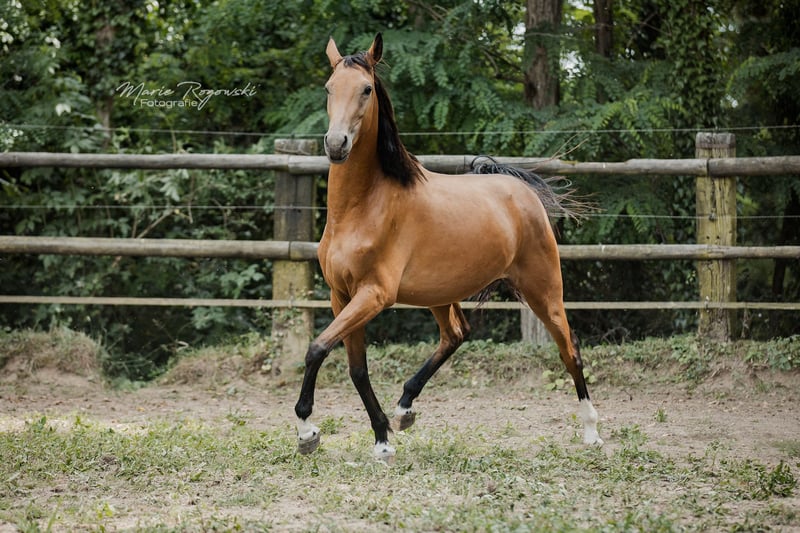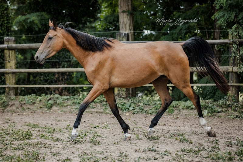 Stute | Zangersheide | Buckskin | geb. 2020 | aktuell 157 cm BUTTERFLY Z ist eine auffällige, sportlich gebaute Stute in seltener Buckskin-Farbe mit exzellentem Bewegungspotenzial. Ihre federnden, taktsicheren Grundgangarten lassen auf eine Zukunft im gehobenen Reitsport schließen - ob Vielseitigkeit, Dressur oder Springen. Vater Bezant stammt aus leistungsgeprüften internationalen Linien mit Schwerpunkt Spring- und Vielseitigkeitssport. Die Mutter Melisande GF ist selbst sportlich veranlagt, überzeugt mit sehr guter Bewegung und ist bereits als zuverlässige Mutterstute bewährt. Butterfly Z verbindet sportliches Talent mit Sonderfarbe und interessanter Abstammung - ideal für Reiter:innen mit Perspektive oder zur Weiterzucht.