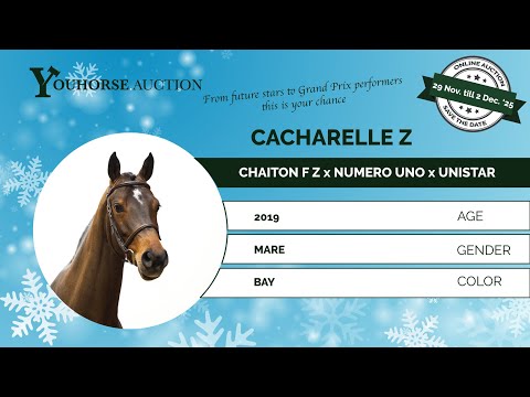 De zesjarige Cacharelle Z is een modern, bloedgemaakt sportpaard met veel kwaliteit. Ze is lichtvoetig, voorzichtig en heeft al concourservaring op 1.10m-niveau. Een echte moderne springtype, en dan ook nog eens gefokt uit de lijn van één van ’s werelds beroemdste springhengsten: Hickstead. Vader is de twaalfjarige hengst Chaiton F Z (1.30m springen), die net als Cornet Obolensky de bewezen bloedcombinatie van Clinton en Heartbreaker verenigt. Moeder Goyave de Hus, een Numero Uno-dochter, staat ook te boek als moeder van de jonge AES-goedgekeurde hengst Vincenté JDW van de D&D Hoeve. Grootmoeder Beaumara, een dochter van de Voltaire-zoon Unistar, bracht onder meer het 1.55m springpaard Cambridge de Hus van Edwina Tops-Alexander en een internationaal 1.45m-paard. Daarnaast is ze de halfzus van niemand minder dan Hickstead. De legendarische Grand Prix-hengst die geschiedenis schreef als Olympisch kampioen in Beijing en winnaar van zowel Aken als Spruce Meadows.