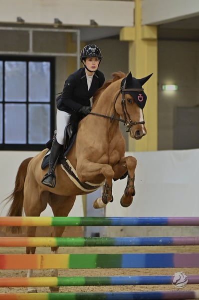 For sale is a 7-year-old charming chestnut mare with a balanced, lovable personality, refined rideability, and talent over fences. She has competed up to 1.15 meters, consistently behaves well, remains motivated and uncomplicated – a delightful partner for both leisure riding and sport.