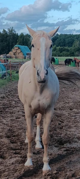 For sale: a beautiful Greater Poland mare with full pedigree. She will turn 9 years old on April 2, 2026. The mare is registered in the main herd book of Greater Poland horses. Cyrkonia is suitable for a single rider; she did not work out in my riding school. However, with proper time and patience, she will learn to trust. She does not like changes or being left alone in the stable. She tends to be a bit spooky during grooming, so she is probably not suitable for a child. She is not a temperamentally hot horse and is quite calm in the saddle. She has been lunged up to 80 cm and is comfortable riding in the terrain both in a group and as a lead horse. She has experience in backyard competitions. Cyrkonia has been ridden in saddle for two years with her previous owner, and she used to pull a carriage. She is up to date with basic vaccinations, regularly dewormed, and has a valid veterinary certificate. She is conflict-free within the herd, usually positioned towards the lower hierarchy. On the paddock, she willingly approaches when called. With her previous owner, she also had a foal, and she will be included with her foal’s foal. Possible exchange for suitable school horses, preferably mares, up to 12 years old, with a minimum height of 170 cm at the withers.