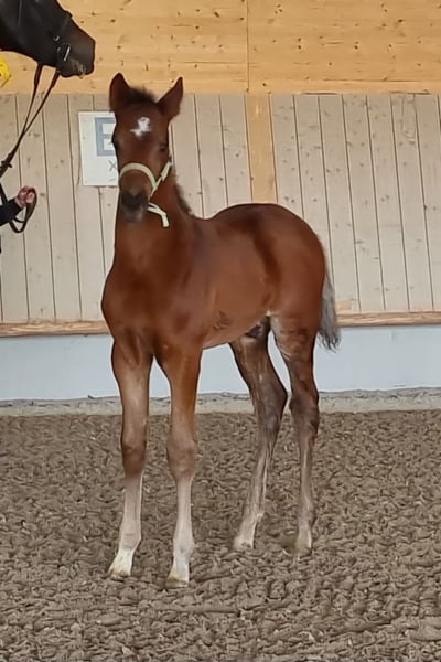 This beautiful and very correctly built dressage stallion was born on March 10, 2025. He is an embryo transfer foal from the famous Vitalos. His mother, Quality Time, is 10 years old this year and an Oldenburg Elite Mare - Pedigree: Quantensprung/Placido. Quality Time has been successfully competing in dressage for years and has won all her tests in 2025 so far. M**, S*, and S** all with scores of 69-70%. She is currently nearly S*** ready and will make her debut at this level this season. Quality Time was also qualified for the Bundeschampionat as a 5-year-old. With this beautiful and talented stallion foal, you are securing the future! Sale is directly from the breeder. The mother is also with us and can be viewed. !! The mare that the foal is at foot with is not the genetic mother but a surrogate mother. The ridden black mare in the videos/pictures is the genetic mother.
